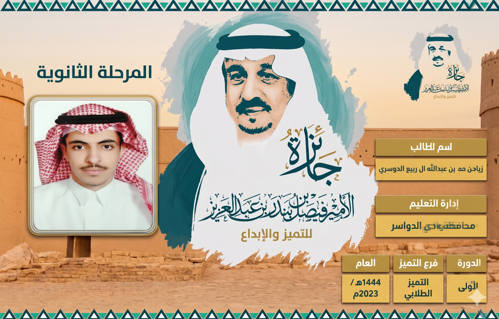 حصد الطالب زياد بن حمد بن عبدالله آل ربيعان من طلاب المرحلة الثانوية جائزة الأمير فيصل بن بندر بن عبدالعزيز للتميز والإبداع في فرع التميز الطلابي ضمن إدارة التعليم بمحافظة وادي الدواسر، تتويجاً لمسيرة من الاجتهاد والعطاء، وعنواناً يضاف إلى سجل إنجازات طلاب مدارس الوادي الأهلية.
